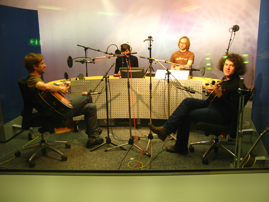 Die Hoteliers fahren zu Jan, es ist direkt um die Ecke. Niklas und Christian wissen es schon, Stefanie und mich haben die lieben Freunde bis jetzt verschont: der Upload hat nicht geklappt und es hat noch immer kein Ende. Mit umwegigen IT-Kniffen bringen wir die Sache zum Laufen, es wird bis vermutlich 14 Uhr dauern, wenn es denn klappt. Auf der Fahrt nach München hält Benni eine Telefonkonferenz mit Jan, der immer, wenn ein neues Fünftel hochgeladen ist, Meldung macht. Als es dann geschafft ist, haben die Kollegen in Köln Probleme mit dem Entpacken, großes Hin und Her, sehr anstrengend, aber ohne Details, die sich hier in Form von Gags, die den Erzählfluß boosten könnten ausschlachten ließen; Ende der Geschichte: es läuft. Zu diesem Zeitpunkt sind wir abgeschafft wie der Weihnachtsmann an Heiligabend, wenn er mit einer Frequenz von ca. 20.000 gpm (Geschenke per minute) seinen Kram ausliefert. Den Aufbau und Soundcheck machen wir völlig nebenbei, fast ohne es selbst zu bemerken. Wir spielen heute nur 20 Minuten und bauen daher nur rudimentär unser Rockinstrumentarium auf, keine Orgel, Klavier, Glockenspiel. Dann holen uns zwei Taxis ab und fahren uns zum Funkhaus des BR, wo wir erst ein paar Lieder live aufnehmen, dann gehen Niklas und ich ins Interview, während die anderen ausgebrannt auf uns warten. Wir bekommen von unserer Moderatorin Kaline eine Flasche Wein und selbstgebackene Zimtsterne, beides haben wir in etwa einer Viertelstunde weg, wünschen uns Portishead mit The Rip und verabschieden uns. Wir fahren schnell ins Feierwerk und essen eine Kleinigkeit, dann gleich weiter ins Hotel, um noch eine Stunde stumpf zu gammeln. Zurück im Feierwerk erleben wir alles sehr passiv, weil wir erschöpft, erleichtert und angetrunken sind. Stefanie stellt einen interessanten Rekord auf und trinkt in weniger als zehn Minuten drei Gin Tonic. Wir gehen auf die Bühne, spielen 4 oder 5 Songs in den dunklen vollen Raum hinein und fallen dann auf eine Couch, wo wir live interviewt werden. Das Konzept des Abends ist nicht ganz klar, zumindest uns. Auf einer Leinwand stehen Songs, die dann gespielt werden, das sind die Jahrescharts von m94,5, wie sie ermittelt wurden, wissen wir nicht. Dazwischen wird moderiert, im Raum kaum hörbar, aber das wird dann ins Radio übertragen und manchmal kommen schrill verkleidete Mädchen auf die Bühne und spielen auf einem Hackbrett irgendwas, was andere dann erraten sollen. Es ist ein bißchen wie Flashbacks von einer müdemachenden Droge, also nicht wie der klassische LSD-Flashback, bekannt aus Film & Fernsehen, sondern eher so, als würde man Träume über die eigene Schulzeit haben und es sind gar keine Träume, sondern man ist wieder da. Zeitreise! Das ist das Wort, nach dem ich gesucht habe. An das Interview habe ich keine Erinnerung, nur daran, daß bei Apokalypse das Gegenteil passiert ist wie in Dortmund. Ich verlange Niklas bestes Gitarrensolo und er spielt es pantomimisch, seine Geräte machen keine Geräusche mehr. (Vermutlich eine Art verspätete Reaktion auf das Desaster in Dortmund? Niklas) Nach dem Konzert geht Niklas mit Hedi, getrunken haben wir vorerst genug, gefeiert eigentlich auch. Wir sehen uns ein bißchen etwas von Frittenbude an und fahren ins Hotel Mark, von dort aus laufen wir in den Imbiss Pipasa (Pizza – Pasta – Salat) und essen noch Pizza, die uns in diesem Moment wie das größte Heilsversprechen des Jahrhunderts erscheint. Nicht fettig, aber heiß, salzig und knusprig und mit einem Biere runtergespült, während im Fernsehen Biathlon kommt. Es ist Damen-Biathlon, eine Schützin hat auf den Sichtschutz ihres Gewehrs ein Foto von einem Baby geklebt, die Kamera fängt es so ein, daß der Schutz ihr eigenes Gesicht bis zum Ansatz ihrer Mütze verdeckt, was den bizarren Effekt ergibt, daß es aussieht, als würde ein Baby schießen und dabei zahnlos in die Kamera lachen. Unheimlich, aber genau, was unser aufgeweichter Verstand verarbeiten kann. Wir rufen laut 'das Baby schießt!' und genießen das Rumsitzen im Imbiß, das seit langem der erste Moment ist, wo nicht noch irgendwas in hektischer Nachtarbeit zu erledigen ist. Die Anspannung fällt in dicken Placken von uns und wir spazieren noch in den Bahnhof, um eine kleine Tafel Schokolade und Getränke zu kaufen. Seltsam, das Konzert war nur wie eine Randnotiz heute. Naja, war ja aber auch so kurz, daß es noch seltsamer wäre, wenn es uns wie ein normales Konzert vorkommen würde. Den sanften weißen Rausch vom Gin Tonic durch den Spaß an Pizza und Biathlon fortschreibend gleiten wir in die Hotelbetten und feiern Benni wie einen Fürsten für die Idee, uns Hotelzimmer zu buchen. |