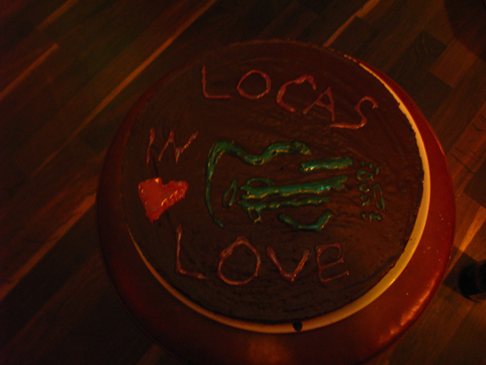 Niklas klopft an die Türe und sagt durch, daß er prüfen gehe ob das Frühstück einen Besuch wert ist und macht dann die Durchsage, daß er empfehle, zur Tafel zu kommen. Ein Eierbrötchen mit viel Salz ist ein prächtiges Katerfrühstück, der Körper schreit nach Salz und Heißem. Dann wie üblich Duschen, Koffer packen und am Bus treffen. Wir wollen unbedingt noch Svana besuchen, die seit kurzer Zeit ein Café betreibt. Den Bus stellen wir in einer unbelebten Baustelle ab und betreten das Café Mania, das sie in ein 'Ramones-Museum' integriert hat, das wiederum Bekannte von ihr machen, eine Sammlung vom Memorabilia wie Jeans, Poster usw. Hungrig noch von gestern essen wir Bagel und Kuchen und freuen uns, Svana wiederzusehen, das letzte mal ist bestimmt Monate her (bzw. sogar sicher, es muß der 17. Februar gewesen sein). Wir lassen unsere Taschen im Café, holen fix Melodika, Ukulele, Baby Taylor (die kleine akustische Gitarre) und ein Snarefell aus dem Bus, da wir ein Treffen mit den Göbel Bros haben, Peer und seine Co-Moderatorin Mila haben uns in die Undertube eingeladen, ihrer Mischung aus physischem und virtuellem Transit, dieser Trambahn im Web, Malte ist Kameramann. Zerschossen von Erkältung, dem Winter, der Tour und der Feier bis in die frühen Stunden hängen wir etwas in den Seilen, aber haben eine wundeschöne halbe Stunde mit unseren lieben Gastgebern. In der rollenden S-Bahn reden wir viel und spielen 'ICE' und 'High Pain Drifter', mal gespannt, wie alles rausgekommen ist und ob wir auch hier wie in München beim BR unser großes Talent entfalten, sobald eine Kamera läuft 20 Jahre älter auszusehen. Das Interview mit Mila und Peer ist schön, weil es kein Frage-Antwort-Katalog ist sondern ein Gespräch, das mögen wir am liebsten, wenn das Reden über Band sein, Platten machen, Touren spielen, Pläne schmieden nicht ins Nichts läuft, sondern sich die beiden Parteien über Dinge reden, die ihnen wichtig sind, die sie ernst nehmen. Viele der Interviews, die wir zur Zeit machen, sind gut, aber oft ist es auch das Abarbeiten der üblichen Fragen, die vielleicht eine Berechtigung haben mögen, uns selber aber mittlerweile langweilen. Die 15,90, die wir für unsere Gruppenkarte bezahlt haben, waren jedenfalls gut investiert, es ist mit Abstand die schönste Bahnfahrt, die wir in Berlin hatten. Auf ein letztes Getränk und zwei Schalen Suppe gehen wir noch einmal zu Svana, die uns beim Verabschieden noch in einen Kramladen um die Ecke schickt, wo wir Instant-Schnee und Duschköpfe kaufen, in denen LEDs sind, die durch Wasserkraft zum Leuchten gebracht werden, so daß man wortwötlich im Licht badet. Ein Lebewohl an Berlin und mit großer Verspätung verlassen wir die Stadtgrenze. Die Fahrt ist langweilig, zumal es dunkel ist und wir so sehr gegen die Zeit fahren. Im Klub essen wir ein schnelles Brötchen und tun uns mit Aufbau und Soundcheck ein bißchen schwer, weil Bühne und Raum eine Kurve machen und wir das Gefühl haben, alle etwas nebeneinander herzuspielen. Wir bekommen Besuch von Miri und Angi, die uns einen Kuchen gebacken haben, außerdem gibt es Kekse und Wein in ernstzunehmenden Mengen. Dann stößt unser Freund Alexander zu uns und die restliche Zeit zwischen Soundcheck und Konzert setzen wir uns mit ihm in unser Backstagegeschoß. Niklas rollt sich in eine Ecke, eine Haltung, die er 'cool' findet und für die er sich manchmal auf schmutzige Böden legt: er provoziert gerne, zB mit Konzepten wie Zurschaustellung von Erdverbundenheit, pfiffigen Wortwitzen, einem eigenen Dialekt, kleinen Geschenken oder unerwarteten Handlungen; oder Kombinationen und Variationen davon. Leider konnten wir heute keinen guten Platz für unseren Beamer finden, die V-Form des Raumes ließ es nicht zu, eine gute Projektionsfläche zu bestimmen, die nicht irgendeinen Raumteil ausgeschlossen hätte, daher leider kein Film während des Konzertes. Wir brauchen heute wieder ein paar Augenblicke länger, um ins Geschehen zu finden, zumal auch ein bißchen Wehmut mitschwingt, denn es ist das letzte Locas-Konzert dieses Jahr, der vorläufige Endpunkt unserer Wintertour. Der Raum, der auf meiner Seite des V ist, ist bestuhlt, der rechte Raum vor Niklas ist bestellt, bzw müssen die Gäste dort stehen. Es ist wieder sehr gut besucht und ganz dicht an der Grenze zu 'zu voll'. Eigentlich kann es nicht ZU voll sein, aber bei Konzerten, wo Leute sitzen und andere nicht, kommt Unruhe rein, wenn zu viele keinen guten Platz haben, denn ihre Ausgangsposition, das Konzert zu hören ist eine völlig andere als die derer, die entspannt sitzen und nicht vom linken auf den rechten Fuß wanken müssen, um sich den Bewegungen des Kopfes, der vor einem steht, anzugleichen und immer an ihm vorbei auf die Bühne zu schauen. Die Atmosphäre im Grünen Jäger ist klasse, es klingt plötzlich auch Welten besser als noch beim Soundcheck, was ja ideal ist, andersrum ist es furchtbar, so herum in Ordnung. Niklas reißen heute viele Saiten, sie verstehen, daß es der letzte Tag ist und wollen ihr Ende inszenieren wie große Entertainer: im Spotlight, auf der Bühne. Niklas ist Gegenständen gegenüber so feinfühlig, daß er instinktiv versteht, was seine Apparate von ihm wollen und reißt energisch alle sechs Saiten und die Brücke von seiner Saturn und wechselt IM Song zurück auf seine akustische Gitarre. Nach dem Konzert ein letztes mal mit alten und neuen Bekannten plaudern und ein großer Abschiedsumtrunk nachdem der Bus beladen ist markiert den letzten Punkt, der hinter die Geschichte gesetzt wird. Selbst unsere alte Freundin Anja ist gekommen, die ganz hysterisch vor Vergnügen darüber ist, daß wir neben ihr scheinbar die einzigen sind, die der Barbie-Hörspielreihe den verdienten Platz im Kanon der deutschen Nachkriegsunterhaltung einräumen. Oh, an dieser Stelle lasse ich mal fallen, was ich den billigsten Scheiß finde, seit es Feuilleton gibt: das inflationäre Arbeiten mit vorgestelltem 'Generation' od